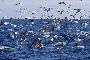 The steep sides of the plateau cause deep-water currents to rise up when they hit the bank; this upwelling brings with it nutrients and minerals from the bottom, feeding the local ecosystem. Over 130 species from numerous classes of the animal kingdom call the bank home at least temporarily. Some such fish are the Atlantic cod, silver hake, yellow-tail flounder, blue-fin and yellow-fin tuna, striped bass, blue fish and numerous species of shark including the great white shark.[1] Shellfish such as the American lobster, sea scallops, squid and ocean quahogs are also prevalent. Many marine birds call the bank home including gannets, shearwaters, storm petrels, fulmars, puffins and razorbills. Reptiles are even present, primarily being represented by the leatherback sea turtle. Possibly the most famous animals on Stellwagen Bank are the mammals. Five species of seals (harp seal, gray seal, harbor seal, hooded seal, and ringed seal), and numerous whale species swim in the waters of Stellwagen.[2] Whale watchers can frequently see humpback whales, minke whales and fin whales. There are occasional sightings of one of the most critically endangered whale species, North Atlantic right whale. Several other whale species can also be seen here including the sperm whale, beluga, orca, pilot whale, White-beaked dolphin, Atlantic white-sided dolphin, common dolphin, bottlenose dolphin, Risso’s dolphin, harbor porpoise, blue whale, and sei whale.[2]