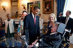 U.S. President Barack Obama talks with Stephen Hawking in the Blue Room of the White House before a ceremony presenting him and 15 others with the Presidential Medal of Freedom on 12 August 2009