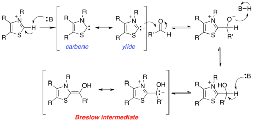 As the Stetter reaction is an example of umpolung chemistry, the aldehyde is converted from an electrophile to a nucleophile under the reaction conditions.[3] This is accomplished by activation from some catalyst - either cyanide (CN−) or thiazolium salt.[1] For the use of either catalyst, the mechanism is very similar; the only difference is that with thiazolium salts, the catalyst must be deprotonated first to form the active catalytic species. The active catalyst can be described as the combination of two contributing resonance forms - an ylide or a carbene, both of which portray the nucleophilic character at carbon. The thiazolium ylide or CN− can then add into the aldehyde substrate, forming a cyanohydrin in the case of CN− or the Breslow intermediate in the case of thiazolium salt. The Breslow intermediate was proposed by Ronald Breslow in 1958 and is a common intermediate for all thiamine-catalyzed reactions, whether in vitro or in vivo.[4]