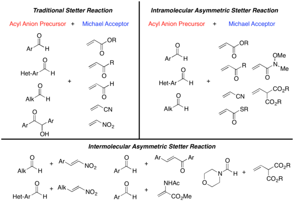 The Stetter reaction produces classically difficult to access 1,4-dicarbonyl compounds and related derivatives. The traditional Stetter reaction is quite versatile, working on a wide variety of substrates.[1] Aromatic aldehydes, heteroaromatic aldehydes, and benzoins can all be used as acyl anion precursors with thiazolium salt and cyanide catalysts. However, aliphatic aldehydes can only be utilized if a thiazolium salt is used as a catalyst, as they undergo aldol condensation side reaction when a cyanide catalyst is used. In addition, α,β-unsaturated esters, ketones, nitriles, nitros, and aldehydes are all appropriate Michael acceptors with either catalyst. However, the general scope of asymmetric Stetter reactions is more limited. Intramolecular asymmetric Stetter reactions enjoy a range of acceptable Michael acceptors and acyl anion precursors in essentially any combination.[5] Intramolecular asymmetric Stetter reactions can utilize aromatic, heteroaromatic and aliphatic aldehydes with a tethered α,β-unsaturated ester, ketone, thioester, malonate, nitrile or Weinreb amide. It has been shown that α,β-unsaturated nitros and aldehydes are not suitable Michael acceptors and have markedly decreased enantiomeric excess in such reactions.[5] Another limitation encountered with intramolecular asymmetric Stetter reactions is that only substrates that result in the formation of a six-membered ring show synthetically useful enantiomeric excess; substrates which form five and seven-membered rings either do not react or show low stereoinduction.[5] On the other hand, intermolecular asymmetric reactions are quite confined to specifically matched combinations of acyl anion precursor and Michael acceptor, such as an aliphatic aldehyde with a nitroalkene.[6] In addition, these substrates tend to be rather activated, as the intermolecular asymmetric Stetter reaction is still in the early stages of development.