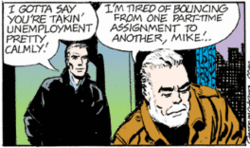 In early 1985 (his last strip was for April 7), Overgard left to focus on his own comic Rudy and other work, and the artwork was then taken over by Fran Matera. The strip was now focused on Nomad, who won a state lottery and was cajoled into a detective business with cop Francis Hogan (1989)— usually as a bodyguard-chauffeur with a penchant for stumbling into crime rings. Their main client (beginning December 1991) was a motel chain owner, the inimitable Emma Stopp. Nomad got engaged to social worker Meg Carey in a long, bumpy relationship that would break up in 2000. Meanwhile, finishing his broadcasting work with some freelancing, Roper retired in Florida and was kept out of sight for ten years. But in 1997 he returned: after brooding over his losses, he had gone to work on a newspaper, and was later fired (1998) for upholding truth over employee loyalty. Tired of the "prison of journalism," he joined Nomad and Hogan in detective work, and by the end of the strip he had again become the leading character. John Saunders continued to write the strip until his death on November 15, 2003. Officially, Matera took over the writing until it was discontinued by the syndicate, although it was ghosted by Keith Brenner, J.S. Earls and Geoffrey Brenneman in the final years. In the strip's last days the dailies featured stories involving Mike, while the Sundays focused on Steve. It has been reported that the dailies of that period were combinations of reprinted and some new art, remaking older stories. One late story dealing with the widow and child of an Iraq-fighting Marine had been told during the 1980s, when the Marine had met his death in Lebanon.[7]
