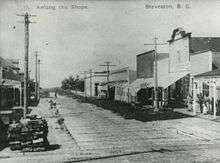 The village is named for Manoah Steves, who arrived with his family around 1877-1878 from Moncton, New Brunswick via Chatham, Ontario. Born Manoah Steeves, a second cousin of William Steeves, he dropped the second 'e' en route. Manoah and his family were the first white family to settle in the area.[2] Steves' son William Herbert actually developed the townsite, which became Steveston in 1889. Salmon canning began on the river in 1871, with the first major cannery being the Phoenix, developed in 1882 by Marshall English and Samuel Martin;[2] by the 1890s there were 45 canneries, about half at Steveston. Salmon-canning was so much part of the life of Steveston that it was also known as Salmonopolis.[3]