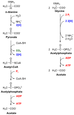 Stickland fermentation or The Stickland Reaction[1] is the name for a chemical reaction that involves the coupled oxidation and reduction of amino acids to organic acids. The electron donor amino acid is oxidised to a volatile carboxylic acid one carbon atom shorter than the original amino acid. For example, alanine with a three carbon chain is converted to acetate with two carbons. The electron acceptor amino acid is reduced to a volatile carboxylic acid the same length as the original amino acid. For example, glycine with two carbons is converted to acetate.