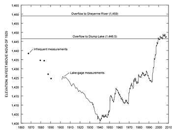 Stump Lake's waters have risen 45 feet in the last few years, and are now at the levels of neighboring Devils Lake. Devil's Lake will overflow into Stump Lake if the surface level reaches 1,447 feet (441 m). Stump Lake, like Devil's Lake, is an endorheic (closed) lake, and has no input or output of rivers or streams, and is only fed by rain or human sources. If water levels exceed 1,458 feet (444 m) the combined lake would flow into the Sheyenne River. This has not occurred since lake levels in this area have been recorded.[2]