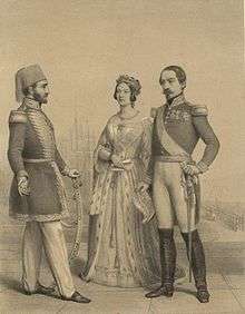 Abdülmecid I (Ottoman Turkish: عبد المجيد اول ‘Abdü’l-Mecīd-i evvel; 23/25 April 1823  25 June 1861), also known as Abdulmejid and similar spellings, was the 31st Sultan of the Ottoman Empire and succeeded his father Mahmud II on 2 July 1839.[3] His reign was notable for the rise of nationalist movements within the empire's territories. Abdülmecid wanted to encourage Ottomanism among the secessionist subject nations and stop the rise of nationalist movements within the empire, but failed to succeed despite trying to integrate non-Muslims and non-Turks more thoroughly into Ottoman society with new laws and reforms. He tried to forge alliances with the major powers of Western Europe, namely the United Kingdom and France, who fought alongside the Ottoman Empire in the Crimean War against Russia. In the following Congress of Paris on 30 March 1856, the Ottoman Empire was officially included among the European family of nations. Abdülmecid's biggest achievement was the announcement and application of the Tanzimat (Reorganization) reforms which were prepared by his father and effectively started the modernization of the Ottoman Empire in 1839. For this achievement, one of the Imperial anthems of the Ottoman Empire, the March of Abdülmecid, was named after him.