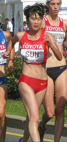At the 2013 World Championships in Athletics she placed fourth behind compatriot Liu Hong. The winner, Russia's Elena Lashmanova was disqualified for doping the following year, but her medal stood.[4] Sun was part of China's silver medal-winning team at the 2014 IAAF World Race Walking Cup, taking 20th individually.[5] She missed national selection in 2015 and 2016, with her most notable result in the period being third in Taicang on the 2015 IAAF Race Walking Challenge.[6]