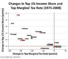 Supply side economics has been criticised for benefiting high income earners. Graph shows the change in top 1% income share against the change in top income tax rate from 1975–9 to 2004–8 for 18 OECD countries. The correlation between increasing income inequality and decreasing top tax rates is very strong.[64]