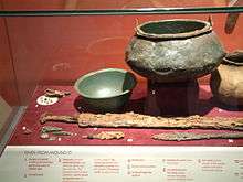 At the east end of the chamber, near the north corner, stood an iron-bound tub of yew containing a smaller bucket. To the south were two small bronze cauldrons, which were probably hung against the wall. A large carinated bronze cauldron, similar to the example from a chamber-grave at Taplow, with iron mounts and two ring-handles was hung by one handle.[98] Nearby lay an iron chain almost 3.5 metres (11 ft) long, of complex ornamental sections and wrought links, for suspending a cauldron from the beams of a large hall. The chain was the product of a British tradition dating back to pre-Roman times.[99] All these items were of a domestic character.