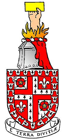 The urban district council was granted a coat of arms in 1947. The design reflected the fact that Swadlincote was formed out of part of the ancient parish of Church Gresley. Around the edge of the shield was a bordure or border in a "vairy" pattern of red and ermine, from the arms of the Gresley family, who took their name from the parish. The dedication of Grespel parish church to Saint George and Saint Mary was represented by their symbols: a cross and fleur de lys respectively. The quartered ermine and red field of the shield was taken from the arms of the Stanhope family, Earls of Harrington. The Tudor roses were taken from the arms of Derbyshire County Council. Above the arms was a crest depicting a human arm holding a billet or: a yellow brick for the local brick making industry. The arm rose from flames, indicative of mining of fireclay and coal. The Latin motto adopted: E Terra Divitiæ ("From the earth, riches") also referred to the mineral industries of Swadlincote.[12] The current arms of the South Derbyshire District Council which bear the motto "The Earth Our Wealth" also reflect this heritage and are borne on local street-name signs.