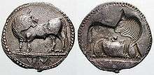 Justin mentions an alliance of Sybaris with the other Achaean colonies Metapontum and Kroton against the Ionian colony Siris. This resulted in the conquest of Siris in the middle of the sixth century BC.[27] In the second half of the sixth century BC Sybaris started minting its first coins, of which the oldest have been dated to approximately 530 BC. These coins employed the Achaean weight standard which was shared with the other Achaean colonies Kroton, Caulonia and Metapontum.[28]