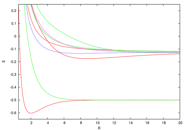 From the graph, we see that only has a minimum corresponding to a separation of 1.3 Å and a total energy , which is less than the initial energy of the system, . Thus, only the even parity state stabilizes the ion with a binding energy of . As a result, the ground state of is and this state is called a bonding molecular orbital.[4]
