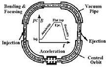 Starting from an appropriate initial value determined by the injection energy, the field strength of the dipole magnets is then increased. If the high energy particles are emitted at the end of the acceleration procedure, e.g. to a target or to another accelerator, the field strength is again decreased to injection level, starting a new injection cycle. Depending on the method of magnet control used, the time interval for one cycle can vary substantially between different installations.