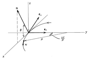 When the charge is in instantaneous circular motion, its acceleration is perpendicular to its velocity β→. Choosing a coordinate system such that instantaneously β→ is in the z direction and is in the x direction, with the polar and azimuth angles θ and φ defining the direction of observation, the general formula Eq. (4) reduces to