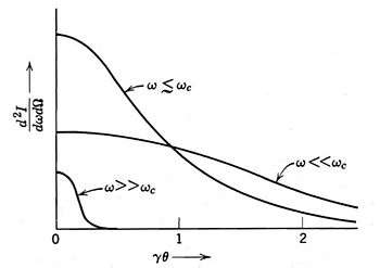 The factors (1 − βcosθ) in the denominators tip the angular distribution forward into a narrow cone like the beam of a headlight pointing ahead of the particle. A plot of the angular distribution (dP/dΩ vs. γθ) shows a sharp peak around θ = 0.