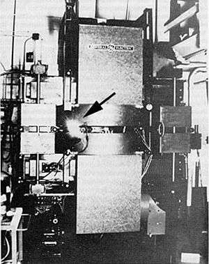 On April 24, Langmuir and I were running the machine and as usual were trying to push the electron gun and its associated pulse transformer to the limit. Some intermittent sparking had occurred and we asked the technician to observe with a mirror around the protective concrete wall. He immediately signaled to turn off the synchrotron as "he saw an arc in the tube." The vacuum was still excellent, so Langmuir and I came to the end of the wall and observed. At first we thought it might be due to Cherenkov radiation, but it soon became clearer that we were seeing Ivanenko and Pomeranchuk radiation.[2]