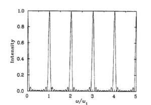 where is the frequency difference to the n-th harmonic. The sum of δ generates a series of sharp peaks in the frequency spectrum harmonics of fundamental wavelength