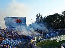 Ultra supporters of Baník call themselves Chachaři, which means "bad boys" in the local dialect.[12] Some of the ultras' songs contain lyrics proudly demonstrating willingness to not only sing, but also fight for their club. Baník's ultras have made friendships over the years, and in 2006 celebrated 10 years of partnership with 2nd division Poland club, GKS Katowice. The celebration took the form of a game between the two teams, organised by the clubs directors. The fixture took place at GKS's stadium, where throughout the 90 minutes the opposing sets of fans sung one another's songs. At the end of the game, both sets of fans climbed over metal fences in order to race onto the pitch come the final whistle to embrace and exchange scarves.[13]