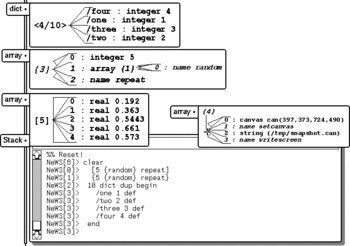 PSIBER visual PostScript programming environment for NeWS, with tabbed windows around objects on and off the stack.[6]