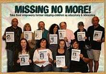 Take Root, a non-profit organization established on a grant from the United States Department of Justice,[1][2][3] is the first missing-child organization ever founded by former abducted children.[4][5] Founded in 2003 and incorporated as a 501(c)(3) in 2005, over five hundred former abducted children have participated, providing peer support to fellow former abducted children, advocating on child-abduction issues from the child-victim's perspective, and providing landmark information on the victimology of child-abduction to multidisciplinary professionals, impacted families, and the public.[5] The agency's mission is to "insert the voice of the primary victim into public and policy discussions on abduction, using the collected wisdom of former missing-children to improve America's missing-child response." Their tags-line are "beyond recovering missing-children; to helping missing-children recover" and, "where missing children are seen and heard." Take Root is the brain child of Melissa "Liss" Haviv, a Fulbright Scholar in cultural anthropology and former abduction victim who is considered a leading expert in the victimology of long term child abduction [5][6][7][8]