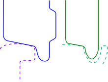 For turnouts (BrE: points), the tips of the switch blades have to be planed down to fit snugly against the fixed or stock rail. The left-hand diagram shows this: on the left is the dotted outline of the rail, with the part remaining after planing-shown shown by a solid line in red. On the right is shown how the two rails fit together when the turnout is closed. The resulting thin pieces of steel are weak, and so old-style turnouts used to make a relatively sudden and sharp angle against the stock rail. With a sudden change in direction, trains were given a jolt and had to proceed slowly.