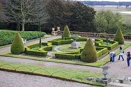 In 1847 the terraces to the south of the house were laid out as an Italian Garden by Edward Milner to a design by Joseph Paxton.[7] Later in the century, in 1883, Wilbraham Egerton added the stone balustrade.[7] The statue of Neptune, which came from Venice, was added in 1920. Over the years changes have been made to this garden, and it was restored to its original design in 1986.[8] In 1859 the Fernery had been built to a design by George Stokes, Paxton's assistant and son-in-law, to the west of the Conservatory to house tree ferns from New Zealand.[9] The Fernery was seen in the TV miniseries Brideshead Revisited.[10]