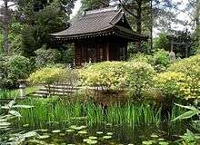 The Japanese Garden is to the west of the southern end of the Broad Walk and is considered to be the finest Japanese garden in the United Kingdom,[24] if not in Europe.[11] Artefacts in the garden include a Shinto Shrine, a tea house, a bridge over the Golden Brook, and a number of lanterns. The garden contains plants, stones and rocks which have been placed to provide a natural balance. The stones and rocks are selected for their shapes, and a mound has been formed to replicate Mount Fuji with its snow-capped summit. The plants include specimens of Japanese maple and various mosses.[25] To the east of the Broad Walk is Maurice Egerton's African Hut.[13] To the north of this is the Maze, which is planted with hornbeam and beech[26]