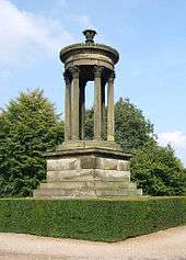 The first formal gardens were created around the early 18th-century house and consisted of a walled garden to the south of the house, a formal semicircular pond to its north and formal lines of trees to the east and west. Later Samuel Wyatt set out an avenue of beeches to the south, which is now the Broad Walk.[3] An arboretum was created during the 18th century and additions have been made to it since. The earliest reference to the arboretum is in 1795 when between five and ten species were present.[4] The first formal garden to be created for the present house was Charlotte's Garden, designed by Lewis William Wyatt in 1814. Lewis also designed the sandstone Conservatory which was originally joined to the house by a glass passageway.[5] This was also known as the Orangery because for a time it was used for growing oranges.[6] In the 1830s a copy of the Choragic Monument of Lysicrates in Athens was placed at the end of the Broad Walk. Gardens were established along the sides of the Broad Walk, including the Leech Pool and the area containing the Golden Brook.[7]