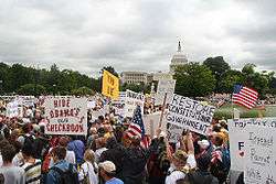 The Taxpayer March on Washington (also known as the 9/12 Tea Party) was a Tea Party protest march from Freedom Plaza to the United States Capitol that was held on September 12, 2009, in Washington, D.C.[1][2] The event coincided with other similar protests organized in various cities across the nation.[3] The protesters rallied against what they consider big government, the dismantling of free market capitalism, abortion, and President Barack Obama's proposals on health care reform, taxation, and federal spending, among other issues.[3][4][5][6][7][8]