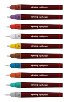 A full set of pens would have the following nib sizes: 0.13, 0.18, 0.25, 0.35, 0.5, 0.7, 1.0, 1.4, and 2.0 mm, which correspond to the line widths as defined in ISO 128. However, the International Organization for Standardization (ISO) called for four pen widths and set a colour code for each: 0.25 (white), 0.35 (yellow), 0.5 (brown), 0.7 (blue); these nibs produced lines that related to various text character heights and the ISO paper sizes.