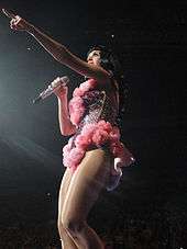 "Wide Awake" is a mid-tempo pop ballad that sees inspiration from electronic and dance-pop; it lyrically discusses the end of a relationship, and was also reportedly influenced by Perry's experience with Brand.[14] "Dressin' Up" is an uptempo, dance-rock and techno song that sees the inclusion of "over-sexualized" lyrical content.[15] The seventeenth track is a remix of "E.T." with new verses provided by Kanye West, while the eighteenth song is a remix of "Last Friday Night (T.G.I.F.)" featuring Missy Elliott.[11] The nineteenth and final track "Tommie Sunshine's Megasix Smash-Up" incorporates elements of Perry's earlier singles "California Gurls", "Teenage Dream", "Firework", "E.T.", "Last Friday Night (T.G.I.F.)", and "The One That Got Away".[16]