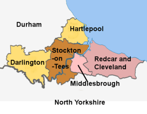 The Tees Valley is a combined authority area in the North East of England nestled between North Yorkshire and County Durham and consisting of the following five unitary authorities: Darlington, Hartlepool, Middlesbrough, Redcar and Cleveland and Stockton-on-Tees, the latter four previously formed the non-metropolitan county of Cleveland between 1974 and 1996. Much of the area formed the County Borough of Teesside before 1974.