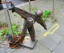 Based in Copenhagen, TEJN's street art has made its mark on most bigger European cities.[2] He is best known by his trademark: "Lock Ons"[3] which are site-specific sculptures or statues, typically welded in recycled iron and chained in the street without permission,[4] often mounted to urban furniture with a bicycle lock.[5] His second most preferred media is paintings on paper, pasted up with wheatpaste on a wall.[6][7] TEJN also makes installations,[8] stencil-art, and conceptual art.[9]