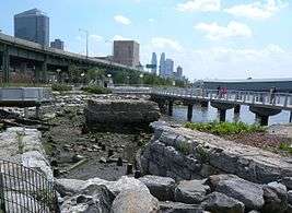 Portions of the former rail yard, such as the New York Central Railroad 69th Street Transfer Bridge, were incorporated into the new park.[2][61][63] The transfer bridge was listed on the National Register of Historic Places in 2003.[67] Nearly a dozen rail yard ruins, such as a burnt warehouse frame, were ultimately integrated into the park.[63] As a reminder of the location's history, New York Central Railroad logos are engraved onto park benches.[63] A block away, on West End Avenue, a privately-owned park has a remnant of a stone wall, as a remaining part of the embankment that dated to 1847. Construction workers had unearthed the stones during construction in 1994; some stones were salvaged for the new park during the four-day construction hiatus for archaeological excavation.[3]