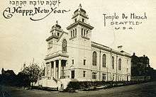 Construction of a synagogue was begun at Boylston Avenue and Marion Street in Seattle.[2][6] A cornerstone was laid in 1901,[2][6] and a basement was built; the congregation held services in the vestry,[2] but rapid growth of the congregation led to the construction of a larger building at Union Street and 15th Avenue.[2][6] Temple De Hirsch was begun in 1907, completed in 1908, and dedicated on the congregation's ninth anniversary, May 29, 1908.[2] An adjacent Temple Center opened in 1924, housing a religion school and other organizations; a wing was added in 1951.[6]