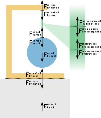In physics, tension, as a transmitted force, as an action-reaction pair of forces, or as a restoring force, is a force and has the units of force measured in newtons (or sometimes pounds-force). The ends of a string or other object transmitting tension will exert forces on the objects to which the string or rod is connected, in the direction of the string at the point of attachment. These forces due to tension are also called "passive forces". There are two basic possibilities for systems of objects held by strings:[1] either acceleration is zero and the system is therefore in equilibrium, or there is acceleration, and therefore a net force is present in the system.
