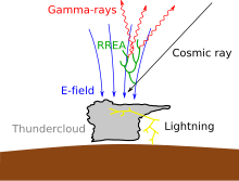 Though the details of the mechanism are uncertain, there is a consensus forming about the physical requirements. It is presumed that TGF photons are emitted by electrons traveling at speeds very close to the speed of light that collide with the nuclei of atoms in the air and release their energy in the form of gamma rays (bremsstrahlung [5]). Large populations of energetic electrons can form by avalanche growth driven by electric fields, a phenomenon called relativistic runaway electron avalanche (RREA).[6][7] The electric field is likely provided by lightning, as most TGFs have been shown to occur within a few milliseconds of a lightning event (Inan et al. 1996).[8][9][10] Beyond this basic picture the details are uncertain. Recent research has shown that electron-electron (Bremsstrahlung) [11] leads first to an enrichment of high-energy electrons and subsequently enlarges the number of high-energy photons.