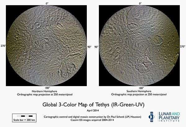 Cassini's observations allowed high-resolution maps of Tethys to be produced with the resolution of 0.29 km.[52] The spacecraft obtained spatially resolved near-infrared spectra of Tethys showing that its surface is made of water ice mixed with a dark material,[20] whereas the far-infrared observations constrained the bolometric bond albedo.[8] The radar observations at the wavelength of 2.2 cm showed that the ice regolith has a complex structure and is very porous.[19] The observations of plasma in the vicinity of Tethys demonstrated that it is a geologically dead body producing no new plasma in the Saturnian magnetosphere.[53]