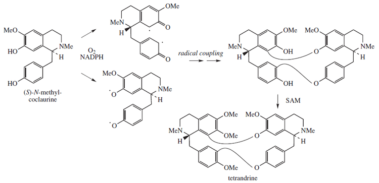 Tetrandrine is biosynthesized from a free radical coupled dimerization of S-N-methylcoclaurine:[10]