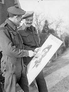 Private F.T.V. Savard shows Lieutenant-Colonel J.D. Stewart, Commanding Officer of The Argyll and Sutherland Highlanders of Canada, a portrait of Colonel Stewart which he is painting, Elshout, Netherlands, 17 December 1944.