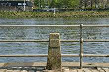 This was the last year that the result was judged by a professional waterman and the controversy resulted in the introduction of the finishing posts.[21] They remain, as of 2014, 113 metres (371 ft) downstream of Chiswick Bridge and are engraved with "UBR" for University Boat Race.[22] The controversy also led to the selection of a former Blue as the umpire, selected by one university from a shortlist drawn up from the other, and alternating each year.[23]