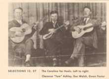The Carolina Tar Heels was an American old time string band. It originally consisted of Dock Walsh (July 23, 1901 – May 28, 1967) on banjo and Gwen Foster on harmonica.[1] Later Clarence Ashley (September 29, 1895 – June 2, 1967) joined on guitar and Garley Foster (January 10, 1905 – October 5, 1968) would replace Gwen on harmonica. Despite sharing a surname Gwen and Garley were not related.[2]