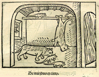 The Greek version of the fable recorded by Babrius concerns a cat that pretends to be a sack hanging from a peg in order to deceive the chickens, but his disguise is seen through by a rooster. This is numbered 79 in the Perry Index. William Caxton tells a very much amplified story of the rats that are the cat's victims. These hold a council and make the decision to stay off the floor and keep in the rafters. The cat then hangs himself from a hook and pretends to be dead, but the rats are not deceived.[1] Later authors substituted mice for rats. The moral lesson taught by these stories is summed up by the English proverb 'Once bitten, twice shy'. The episode of the rats holding a council is similar to the fable of The Mice in Council who suggested hanging a bell on the cat, but that only developed during the Middle Ages and has a completely different moral.