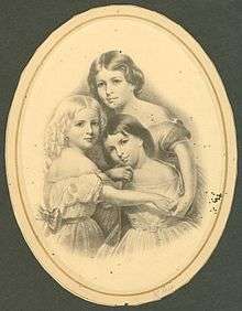 "The Children's Hour" was included in the Birds of Passage section at the end of the 1863 collection Tales of a Wayside Inn.[2] Longfellow's publisher James Thomas Fields was enthusiastic about the poem, noting that it would be adored by "the parental public".[3] A group portrait of the three Longfellow daughters by Thomas Buchanan Read was widely reproduced and distributed along with the poem. A copy of the print was found near the body of a soldier at the American Civil War Battle of Gettysburg after the July 1 – July 3, 1863 battle, now held by the Maine Historical Society.[4] In 1883, a year after the poet's death, a tableau vivant was staged titled Longfellow's Dream and featured his life and works, including "The Children's Hour".[5]