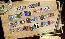 During the 2007 San Diego Comic-Con International, 42 Entertainment launched WhySoSerious.com, sending fans on a scavenger hunt to unlock a teaser trailer and a new photo of the Joker.[120] On October 31, 2007, the film's website morphed into another scavenger hunt with hidden messages, instructing fans to uncover clues at certain locations in major cities throughout the United States, and to take photographs of their discoveries. The clues combined to reveal a new photograph of the Joker and an audio clip of him from the film saying "And tonight, you're gonna break your one rule." Completing the scavenger hunt also led to another website called Rory's Death Kiss[121] (referencing the false working title of Rory's First Kiss), where fans could submit photographs of themselves costumed as the Joker. Those who sent photos were mailed a copy of a fictional newspaper called The Gotham Times, whose electronic version led to the discovery of numerous other websites.[122][123]