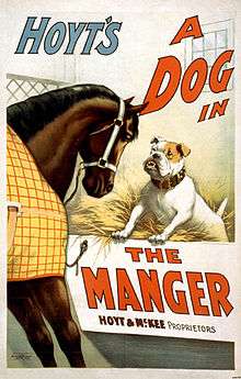 Popular artistic allusions to the fable, or the idiom arising from it, were especially common during the 19th century. Where Lope de Vega had adapted the theme to a problem play in the 17th century, the Belgian composer Albert Grisar used it as the basis for his one-act comic opera of 1855, Le chien du jardinier.[18] The idiom was also taken up in the USA by the successful writer of farces, Charles Hale Hoyt, where a horse rather than the more common ox figured on the 1899 poster (see left). The title has also been used in various media since then, but without reference to the fable in publicity or on covers.