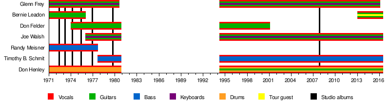 In February 2013, the Eagles released a career-spanning documentary called History of the Eagles and began the supporting tour with 11 US arena dates from July 6 to 25.[74] Henley said that the tour, which expanded internationally and continued until July 29, 2015,[75] "could very well be our last...we're gonna include at least one former band member in this tour and kinda go back to the roots, and how we created some of these songs. We're gonna break it down to the fundamentals and then take it up to where it is now."[76] Original Eagles guitarist Bernie Leadon also appeared on the tour. Walsh stated, "Bernie’s brilliant, I never really got a chance to play with him, but we've been in contact. We see him from time to time, and I'm really glad he's coming because it's going to take the show up a notch, and I'm really looking forward to playing with him, finally."[77] Former members Randy Meisner and Don Felder did not appear.[75] Meisner had been invited but could not participate for health reasons, while Felder was never asked. Though his lawsuits against the Eagles were settled in 2007, Henley claimed that Felder continued to "engage in legal action, of one kind or another" against the band, but did not state what actions those are.[75]
