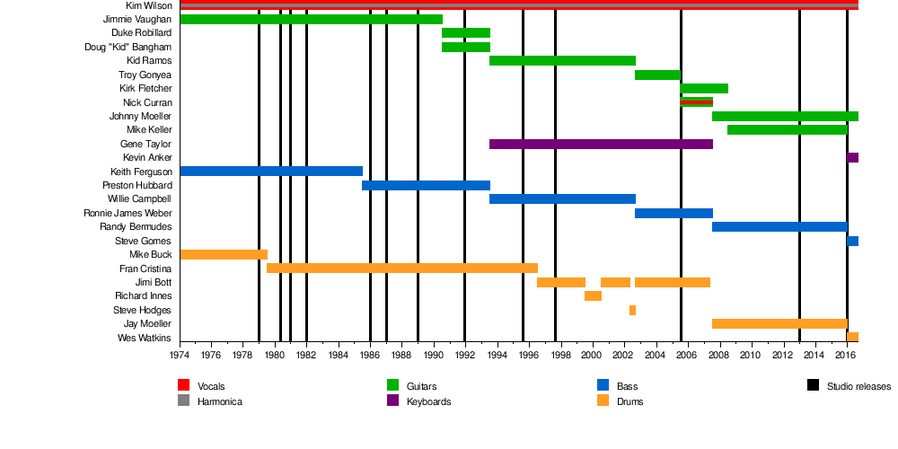 | Past members | Jimmie Vaughan, Richard Innes, Keith Ferguson, Mike Buck, Fran Christina, Preston Hubbard, Duke Robillard, Doug "Kid" Bangham, Gene Taylor, Kid Ramos, Willie Campbell, Jimi Bott, Richard Innes, Steve Hodges, Ronnie James Weber, Troy Gonyea, Kirk Fletcher, Nick Curran , Randy Bermudes, Jay Moeller, Mike Keller |