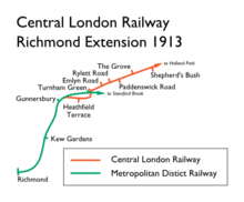 The station was to have been built on the CLR's planned underground extension from Shepherd's Bush to Gunnersbury proposed to parliament in November 1912.[1] The extension was to continue on the London and South Western Railway (L&SWR) surface tracks to Richmond already used by the District Railway (DR). The station would have been between Paddenswick Road to the west and Shepherd's Bush to the east.[2]