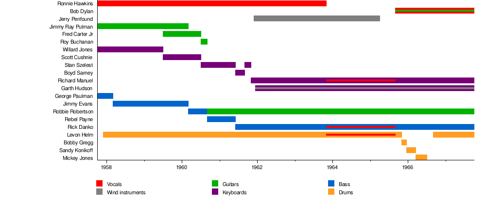 The Hawks / The Levon Helm Sextet / Levon and the Hawks / The Canadian Squires / Bob Dylan & The Band Timeline