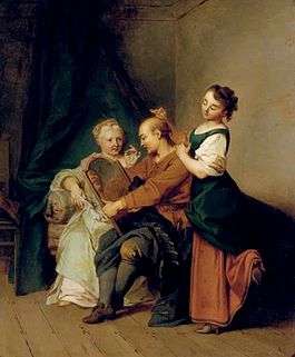 At the start of the 18th century in Britain, the fable was given a political interpretation. Matthew Prior's "A Fable" (1710) was applied to the situation of the reigning monarch, caught between the two political parties of the day.[5] The Scots poet Allan Ramsay adapted La Fontaine's fable into dialect as "The Man wi the Twa Wives" somewhere between 1722-9. In the wake of the widespread appropriation of fables to political ends in previous decades, he makes the two wives supporters of opposing parties in addition to hair-pluckers and draws the conclusion that truth is the victim of extreme opposing views.[6] At the other end of that century, the fable was adapted by F. G. Waldron (1744–1818) as "The man with two wives or, wigs for ever! A dramatick fable set to musick by Mr. Sanderson". It was first performed at the then Royalty Theatre in Tower Hamlets[7] on March 24, 1798, to such popular acclaim that copies of the piece soon appeared for sale there. The conclusion of this musical romp is that the trio finally order wigs 'from Britain' so that all may change the colour of their hair at will.[8]